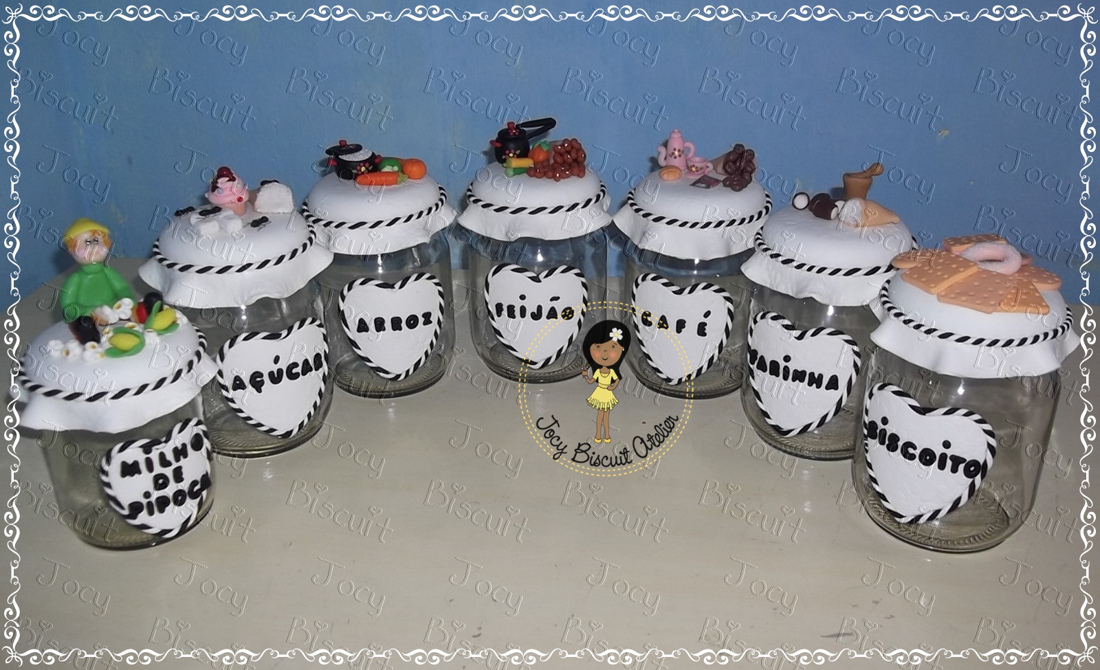 Lindos potes de vidro decorados com biscuit, tudo modelado à mão,